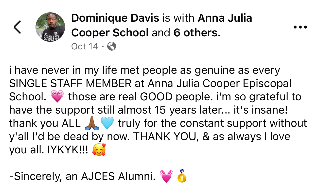 Every once in a while, a shout out from a grad stops us in our tracks. Recently, one of our alumni shared a post on Facebook thanking us for “15 years of love and support.” His words are a powerful reminder of why we do what we do—and of the lasting impact of a community built on love, trust, and belonging. A heartfelt thank-you to our Grad Support Team, TeShawn Cunningham and Markaya James, and dedicated teachers who continue to walk alongside our alumni wherever life takes them—no judgment, just love. |