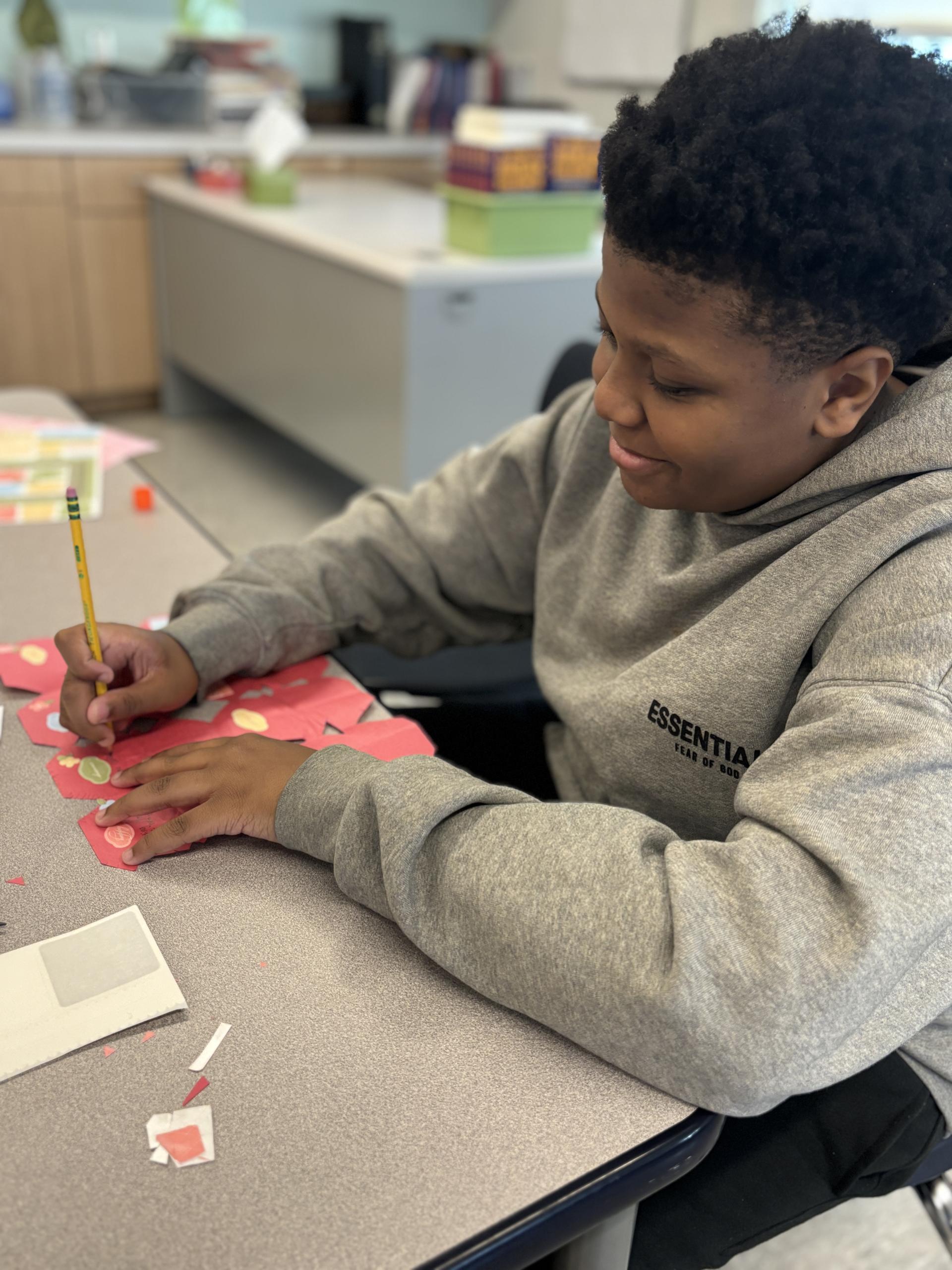 7th grader, Jeylan, crafts a card to brighten a veteran's day. |